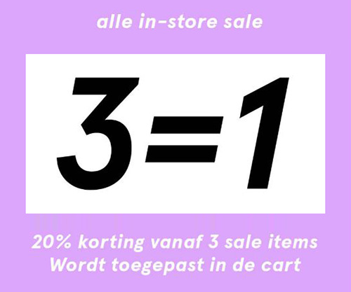 Shop nu 20% extra korting vanaf 3 sale items. Deze korting wordt verrekend in de cart en wordt berekend over de reguliere saleprijs.